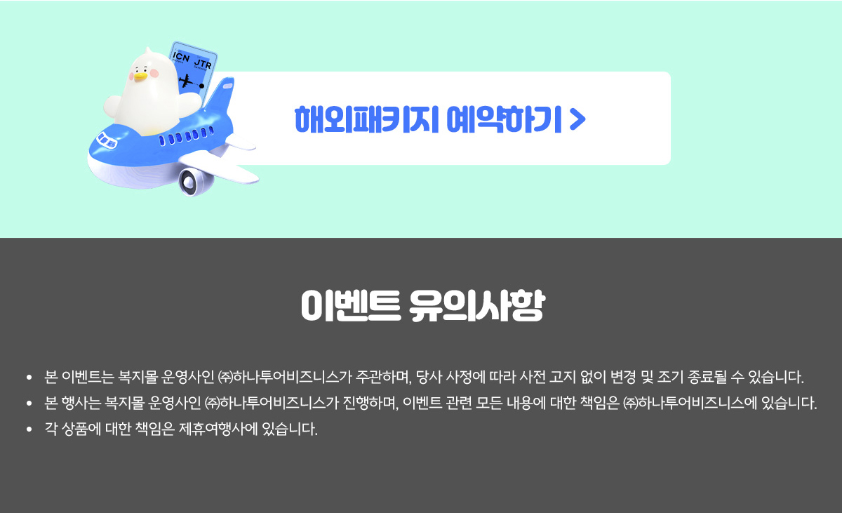 하나투어비즈니스는 통신판매중개업으로 등록된 상품 및 서비스 내용에 대한 모든 책임은 각 여행사에 있습니다.